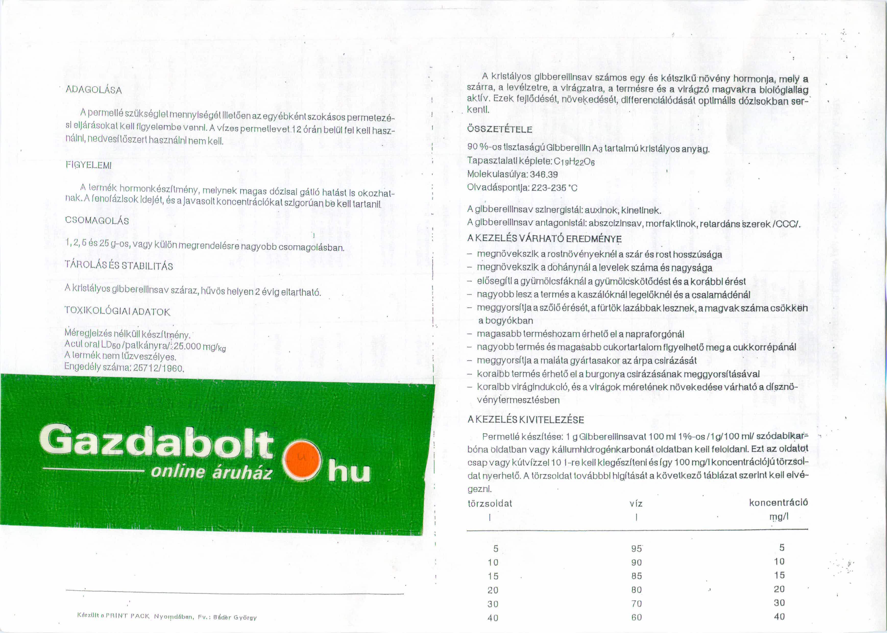 Najstarejši znani rastlinski hormon, odkrit na Japonskem leta 1935. Na rastline ima številne učinke, npr. z njim lahko škropimo riževa semena, da zrastejo do zelo velikih dimenzij, z njim zdravimo agrume, da obilno cvetijo, itd. Vendar je njegova najpomembnejša lastnost v tem primeru prekinitev obdobja mirovanja mirujočih semen, kar jih spodbudi k takojšnjemu kaljenju. Uporablja se lahko v širokem razponu koncentracij (ppm-delcev na milijon), odvisno od drugih aplikacij.