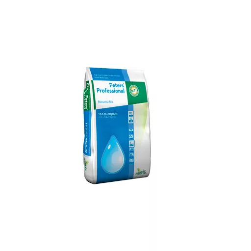 Peters Professional 17-07-27 (Poinsettia Mix) je gnojilo, razvito posebej za gojenje poinsettijev, ki v celoti izpolnjuje posebne potrebe te vrste po hranilih. Peters Professional 17+07+27 (Poinsettia Mix) vsebuje spremenljivo mešanico bora, cinka in molibdena, ki zagotavlja zdravo in kakovostno cvetočo rastlino. Vsebuje visoko raven nitratnega dušika.