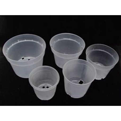 Brezbarvni lončki za gojenje orhidej. Ne smete jih postaviti v lonec, saj morajo biti zračne korenine orhidej za pravilno rast izpostavljene sončni svetlobi.