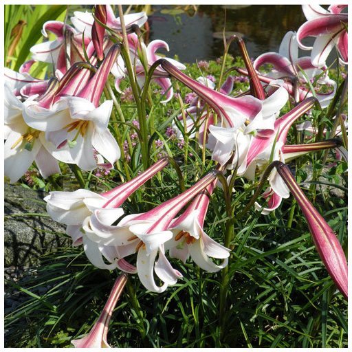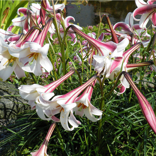 Ta čudovita lilija izvira iz Tajvana. Elegantna, visoka sorta z razpršenimi listi. Cveti poleti ali zgodaj jeseni. Cvet je trobentaste oblike, dolg 20 cm, vodoravno pokončen, zelo dišeč, z belimi, na zunanji strani vijoličastimi črtami.