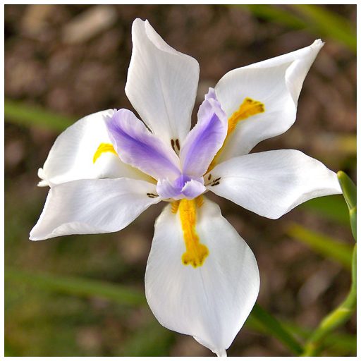 Znana vrsta, ki izvira iz gozdov Južne Afrike. Listi so širši kot pri Dietes bicolor, cvetovi so beli z rumenimi ali rjavimi pikami.