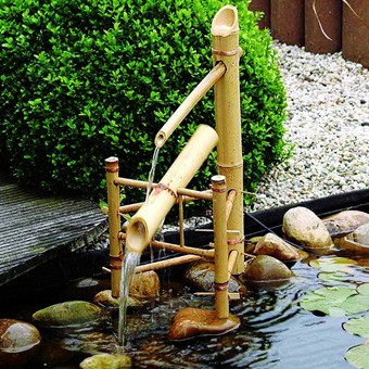Ta "vodna igrača" iz bambusa pritegne pozornost ne le s svojim videzom, temveč tudi z gibanjem in občasnim brizganjem vode. Neumorno deluje podnevi in ponoči. Glede na višino dvigala zadostuje 10-15 W vodna črpalka, ki jo poganja. Njegovo stalno gibanje odganja tuje živali in mačke - uporaben, lep in igriv okras za vaš vrt ali ribnik.