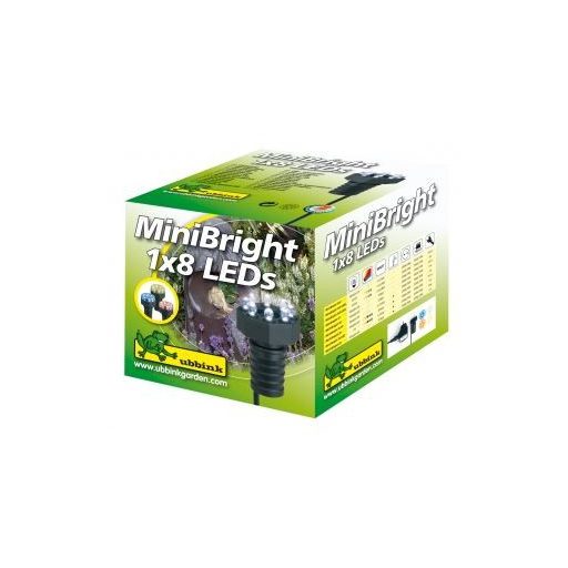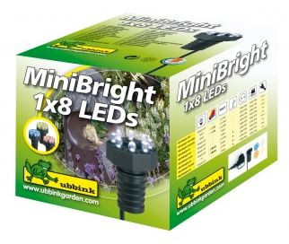 Osvetlitev MiniBright 1x8 LED Mini Bright 1*8 LED luči za ribnik, samo za uporabo v vodi. Odlična za osvetlitev fontan, slapov itd. Moč 0,6 W. Deluje na 12 V enosmerni tok. Svetilki LED je priložen kabel dolžine 5 m, ki omogoča prilagodljivo namestitev. R...