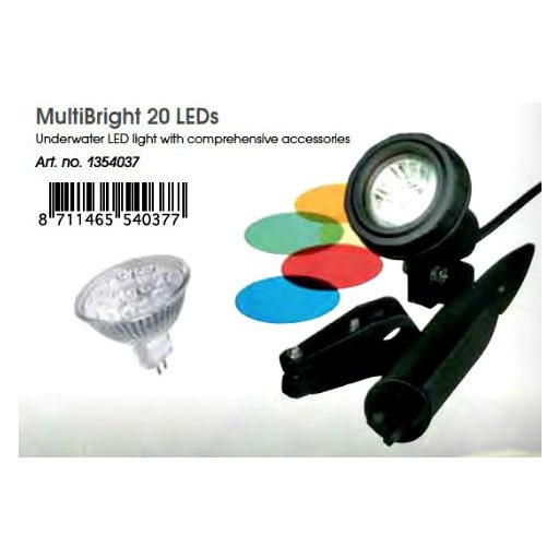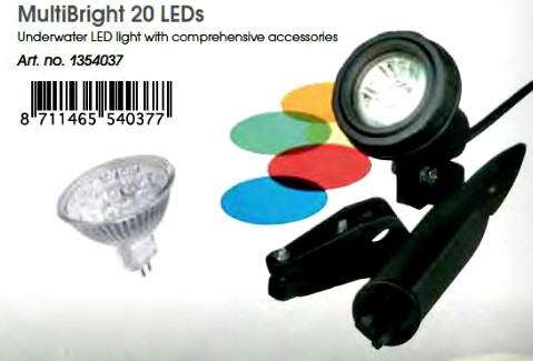 Multibright Led, Odlična za osvetljevanje fontan, slapov. Moč 1,25 W. Deluje na 12 V enosmerni tok. Kabel dolžine 10 m, ki je priložen svetilki LED, omogoča prilagodljivo namestitev. Za doseganje različnih barvnih učinkov lahko uporabite barvne diske, ki...