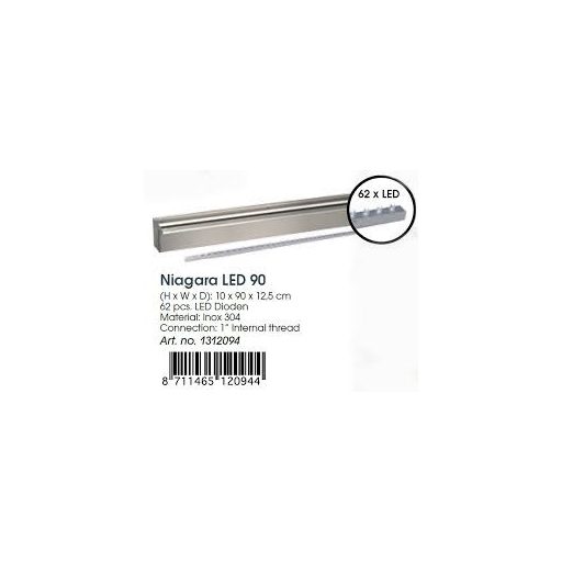 Element slapa iz nerjavečega jekla. Enostaven za namestitev, z LED osvetlitvijo (po želji). Velikost priključka: 1" Število diod LED: 62 kosov. Velikost: 90 x 10 x 12,5 cm.