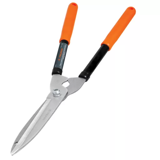Škarje za živo mejo, glava 19 cm, jeklen ročaj, gumijast ročaj. Skupna dolžina: 55,5 cm.
