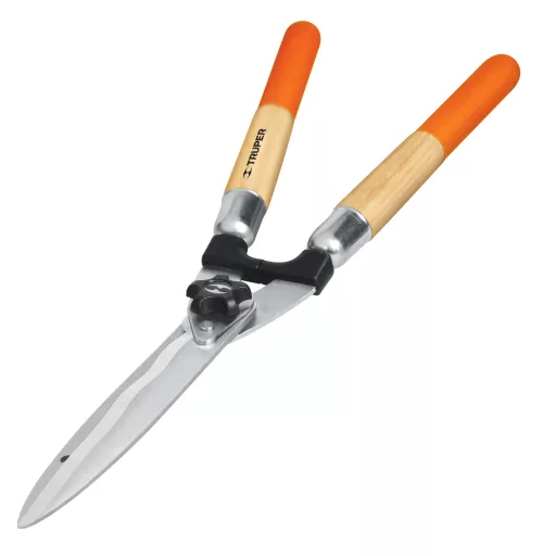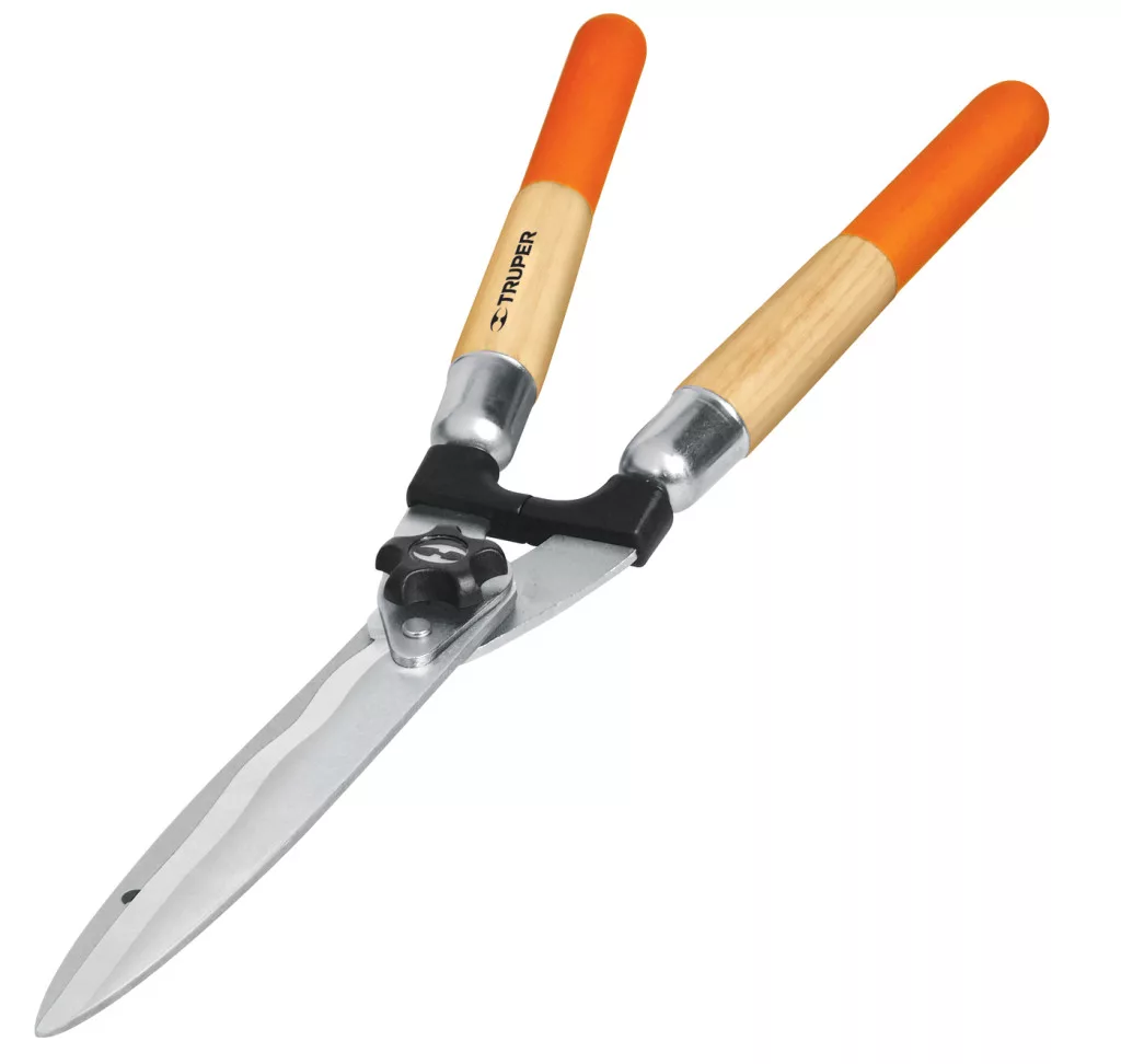 Škarje za živo mejo, gumb za nadzor napetosti, gumijast ročaj, valovit rob, skupna dolžina: 56,4 cm