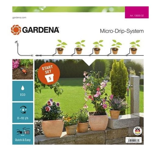 Posebna ponudba sistema GARDENA Micro-Drip-System, začetni set za lončnice S, vsebuje vse, kar potrebujete za priročno in varčno zalivanje 5 lončnic na terasi ali balkonu. Osnovni element za zmanjševanje tlaka lahko z adapterjem priključite na vodovodno pipo. Lončnice lahko zalivate natančno in posamično s kapljalniki. Patentirana tehnologija priključevanja "Click and Ready" omogoča enostavno in hitro montažo in demontažo elementov. Vključuje: 1x osnovni element 1000 1x navojni cevni element 10 m razdelilne cevi 5x prebodni trn 4,6 mm 3/16" 5x T-element 4,6 mm 3/16" 1x tesnilno tesnilo 4,6 mm 3/16" 5x nastavljiva končna kapalna glava