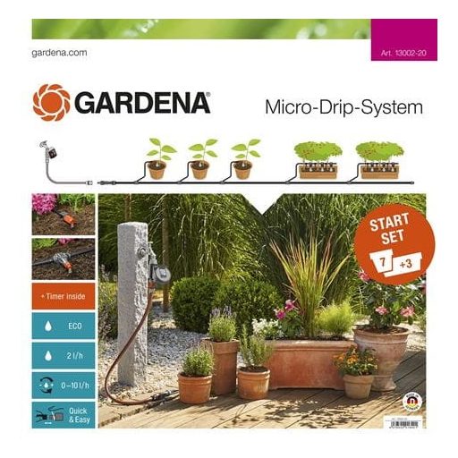 Začetni set GARDENA Micro-Drip-System za lončnice M automatic se lahko uporablja za priročno in varčno zalivanje 7 lončnic in 3 cvetličnih korit na balkonih in terasah. Osnovni element z zmanjšanim tlakom je mogoče prek cevi priključiti na vodovodno pipo. Lončnice lahko zalivate natančno in posamično s kapljalniki. patentirana tehnologija priključevanja "Klikni in naredi" omogoča enostavno in hitro montažo in demontažo elementov. Sistem samodejno upravlja GARDENA namakalni računalnik. Vsebina.