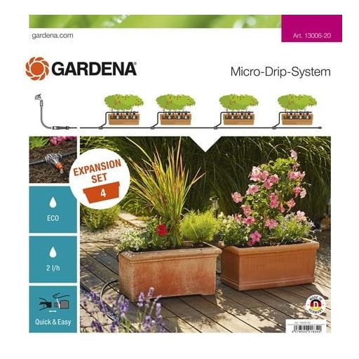 Sklop podaljška GARDENA Micro-Drip-System za lončnice XL je idealen podaljšek za začetni set Micro-Drip za lončnice M in začetni set za lončnice M automatic. Vsebuje vse, kar potrebujete za natančno namakanje 4 dodatnih cvetličnih ali rastlinskih korit. Patentirana tehnologija povezovanja "Click and Ready" omogoča enostavno in hitro razširitev sistema. Vključuje.