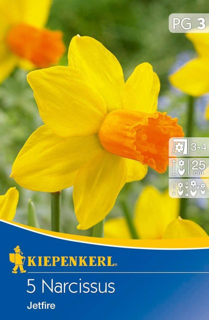 Značilnosti narcise Jetfire: Po cvetenju čebulic ni treba obirati. Najraje ima sončne in polsenčne prostore, lahko jo posadite v okensko škatlo in se dobro razmnožuje. Višina: Višina: 25 cm. Cvetenje: Cveti marca in aprila.