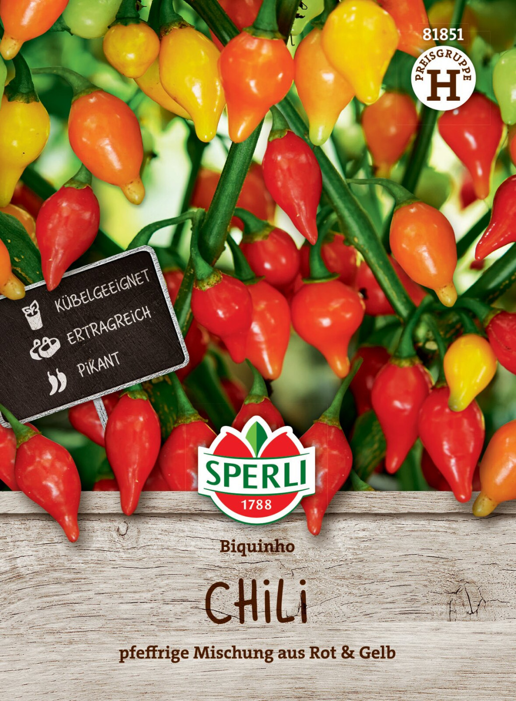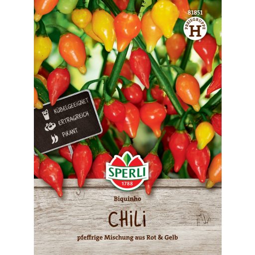 Okrasna mešanica rumene in rdeče paprike v obliki kapljice, ki je odličen vrtni okras. 'Biquhino' ima približno 3 cm dolge plodove sladkega sadnega okusa z rahlo pekočo noto. Vsaka rastlina proizvede približno 100 plodov. Optimalno primerna za gojenje v posodah. Nasvet: Odstranite prvi cvet, da bo rastlina obrodila veliko novih plodov. Redno zalivajte in oskrbujte s hranili. Sadite od sredine maja (po zmrzali).