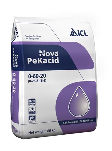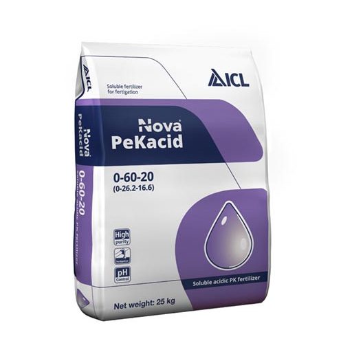 Ima izredno močan učinek zakisovanja in moč nevtralizacije bikarbonatov 240, kar pomeni, da 1 kg Nova PeKacid 240 g HCO3- ion iz vode za namakanje, hkrati pa nadomesti 600 g P2O5 in 200 g K2O.