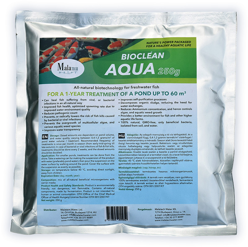 Bioclean Aqua je dopolnilni izdelek k Bioclean Pond Clarifier za vrtne ribnike ali večja živa vodna telesa (ribiški ribniki, lagune itd.). Samostojno se uporablja predvsem v ribogojstvu. Količina vode, površina in ekološko stanje ribnika močno vplivajo na odmerjanje. Načeloma velja, da večji kot je ribnik, bolj razvita je njegova mikrobiološka populacija in večja je naravna ekološka raznolikost.s naravno zmogljivostjo čiščenja, kar pomeni, da je za rešitev njegovih ekoloških težav potreben manjši odmerek. Majhni vrtni ribniki in ljubiteljski ribniki s površino, manjšo od 1 ha, kjer je naravna samočistilna sposobnost minimalna, so v najslabšem položaju in je treba uporabiti najvišji specifični odmerek.