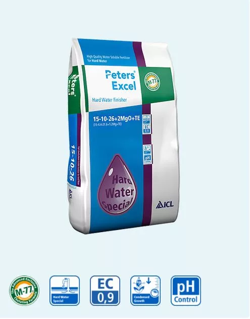 Peters Excel 15-10-26 (Hard Water Grow Special) omogoča kompaktno rast tudi v razmerah s trdo vodo. Zaradi visoke vsebnosti kelatnih mikrohranil je gnojilo Peters Excel 15-10-26 (Hard Water Grow Special) zelo učinkovito gnojilo zagnojilo zagotavlja svetlo barvo in zdravo rast.