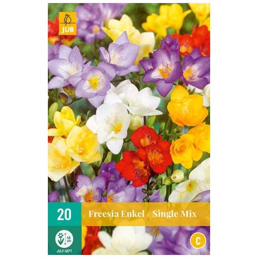 Virághagyma Frézia Enkel/Single mix 20 db JUB je skrbno izbrana mešanica enostavnih cvetov frezije, ki s svojimi raznolikimi, živahnimi barvami okrasi vrt ali teraso. Oznaka Enkel/Single mix pomeni posamezne, nepolne cvetove, ki gredicam in šopkom dajejo prefinjen, eleganten videz.