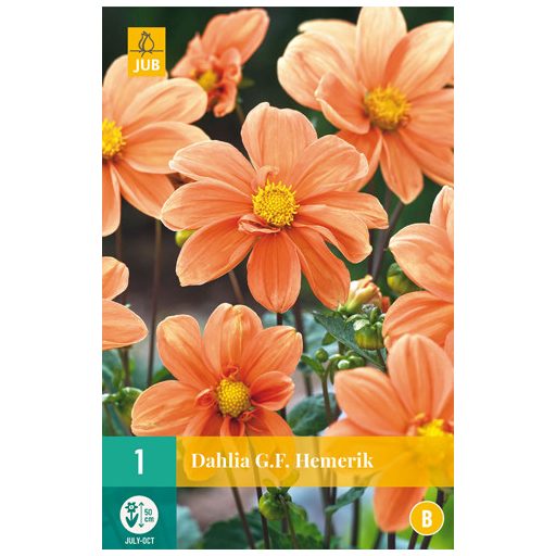 GF Hemerik je simfloidna dalija, ki vam bo nudila večmesečno zadovoljstvo. GF Hemerik cveti vse poletje od julija do prvih zmrzali. GF Hemerik zraste do približno 70 cm v višino. Ta dalija je zato idealna tudi za sajenje v lončkih na terasah ali balkonih.