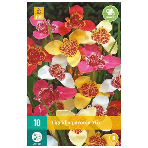 Tigridia pavonia hibrid (tigrova cvetlica ali mehiška školjka) ima 15 cm velike trikotne cvetove. Ima trikotno obliko s tremi trikotniki, velikimi od 3 do 5 cm, in je zelo pisana. Listi spominjajo na mečeve cvetove ali irise. Rastlina ima več cvetov na vejo, vsak cvet pa cveti le nekaj dni. Višina 45 cm.