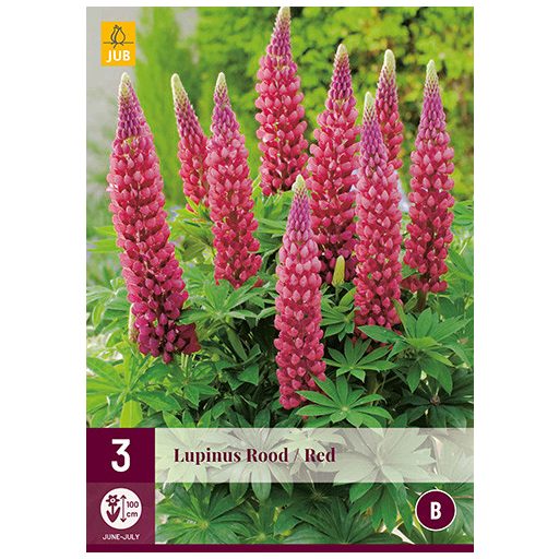 Lupinus rdeče barve dobro raste na odprtih površinah. Bujni zeleni listi volčjega boba so dlanasto sestavljeni in ostanejo pod cvetovi. Cvetovi so razporejeni v dolgih grozdih okoli stebla. Višina 90-100 cm.