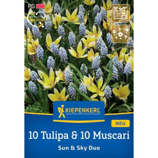 Mešanica čebulic 10 Tulipa & 10 Muscari Sun and Sky Duo Kiepenkerl 20 kos je skrbno izbrana zbirka jesensko sajenih cvetličnih čebulic. Paket vsebuje 10 tulipanov (Tulipa) in 10 šopkovnih perunik (Muscari), ki skupaj ustvarijo harmonično, a kontrastno spomladansko cvetenje.