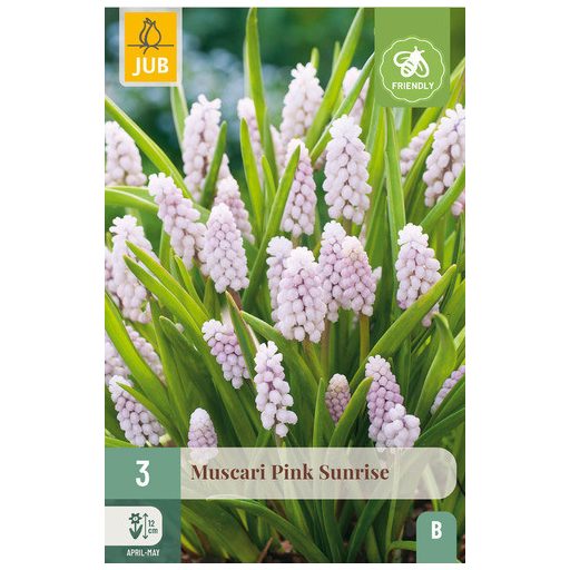 Lastnosti sorte Muscari 'Pink Sunrise': Velikost čebulice 5/+ Višina v cm: 12 Čas cvetenja april - maj Čas sajenja september - december Značilnosti: Posebna sorta muscarija z rožnatimi cvetovi. Zahteva svetel položaj...