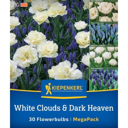 Cvetna čebulica Tulipán-Gyöngyike Mega-Pack White Clouds&Dark Heaven lastnosti: Količina: 30 kos tulipan/gyöngyike čebulic Barva: bela, modra Priporočeni čas sajenja: september–december Čas cvetenja: april Uporaba: Lahko se posadi tudi v balkonsko korito