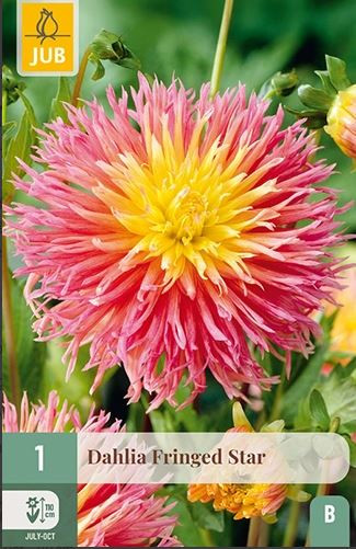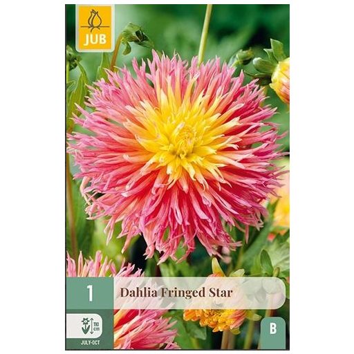 Okrasna dalija 'Fringed Star' je posebna sorta, ki izstopa s svojo edinstveno obliko cvetov. Lističi so nežno rezani in rahlo puhasti na robovih, kar cvetovom daje igriv in prefinjen značaj. Odpre se v toplih rumenih in rožnatih odtenkih, pogosto v kombinaciji s svetlejšimi toni, kar ustvarja živobarvno igro. 'Fringed Star' cveti obilno od julija do prvega mraza in zraste približno 90–110 cm visoko. Gomolje sadimo spomladi v rahlo, dobro odcedno zemljo na sončno mesto. 'Fringed Star' ni odporna na zimo, zato je zaščita pred poznejšimi zmrzali nujna.