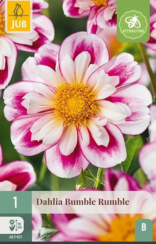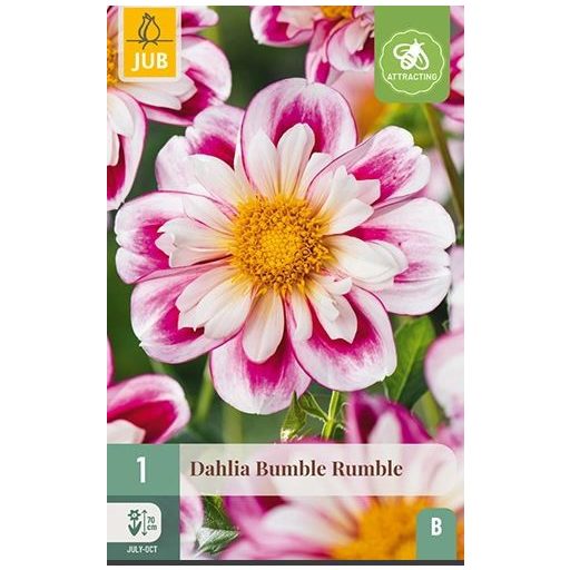 "Bumble Rumble" dalija je vesela in edinstvena dalija, ki takoj pritegne pozornost s svojo izrazito igro barv. Beli listi cvetov so igrivo okrašeni z rdečimi in rožnatimi črtami, kar v poletnem vrtu ustvarja živ in igriv vtis. Ta velikocvetna dalija cveti obilno od julija do prvih zmrzali in zraste približno do 70 cm višine. Popolna je za sončne robnike, a je prav tako čudovita v prostornem loncu ali koritu na terasi ali balkonu.