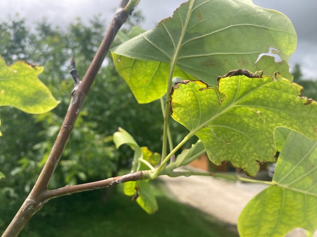 A fa tavasszal szépen befakadt, majd a képen látható módon először elkezdtek barnulni a levelei, majd teljesen el is száradtak. Az új hajtásoknál is ugyanez volt sajnos a folyamat. Ami érdekes volt, hogy a fa levelei foltosodtak és el is vékonyodtak majd emiatt szakadások is keletkeztek benne. Természetesen a fa locsolására odafigyeltem, de a tavasz egyébként is nagyon csapadékos volt. Mára sajnos már csak 1-2 levele van a fának.