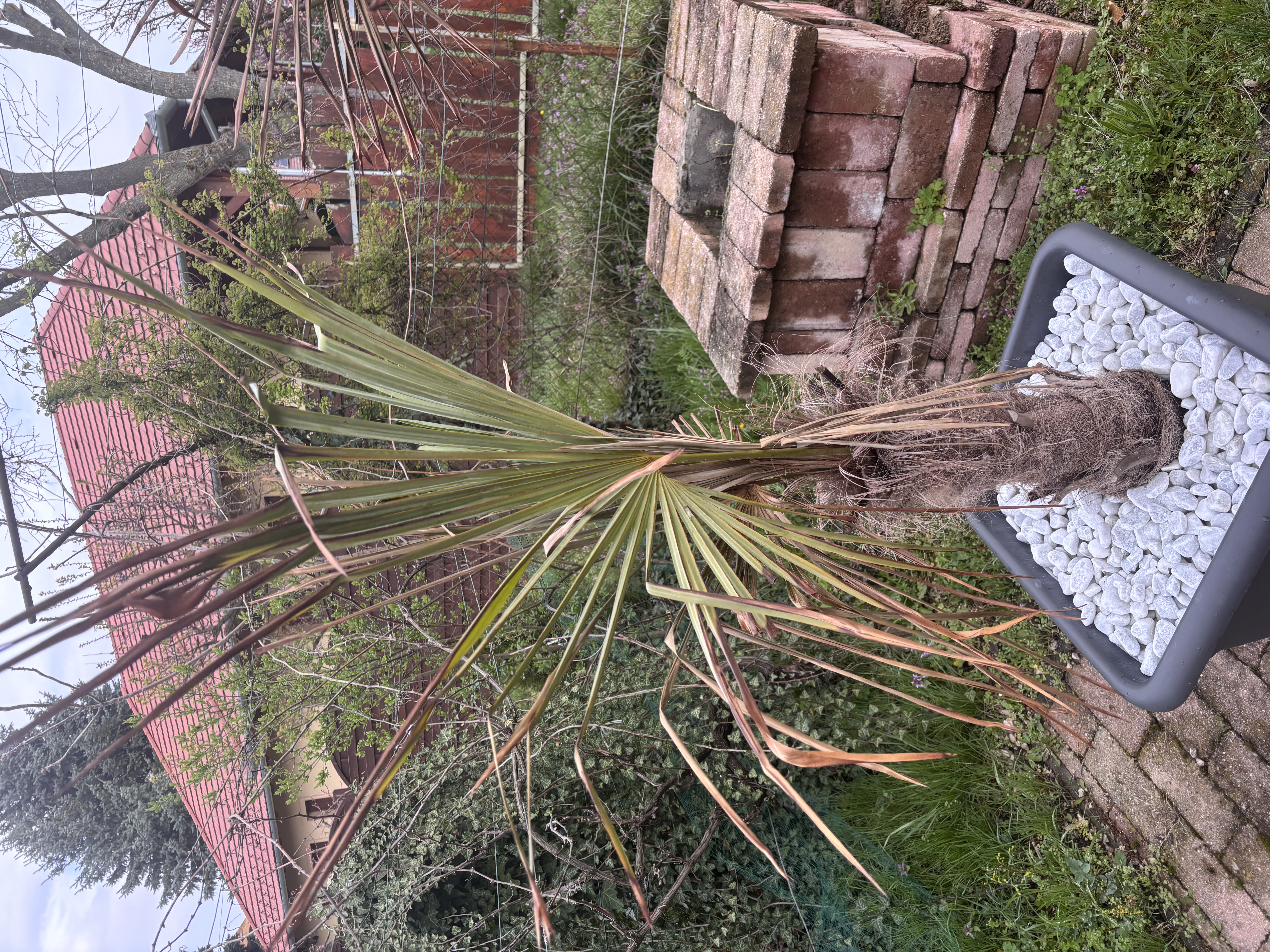 Kedves Dávid. Az átültetést mindig megsínyli a növény. Jobb volna a fehér kavicsot is elhagyni: visszaveri a tűző napot. A legjobb lenne a kertbe, a talajba kiültetni a növényt: a kínai kenderpálma téltűrése jobb a talajban, mint bármekkora edényben, ami könnyen kiszárad, illetve átfagy, nyáron felforrósodik, különösen, ha az műanyag.