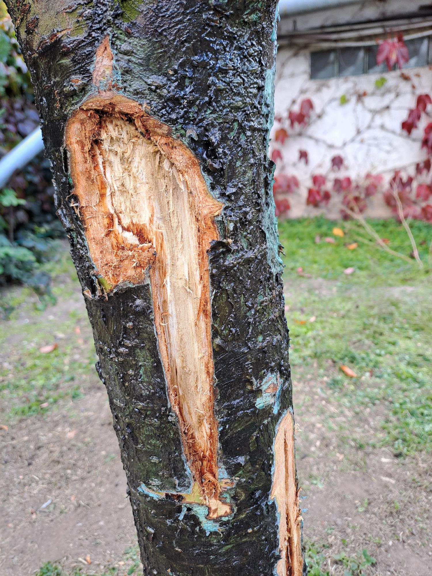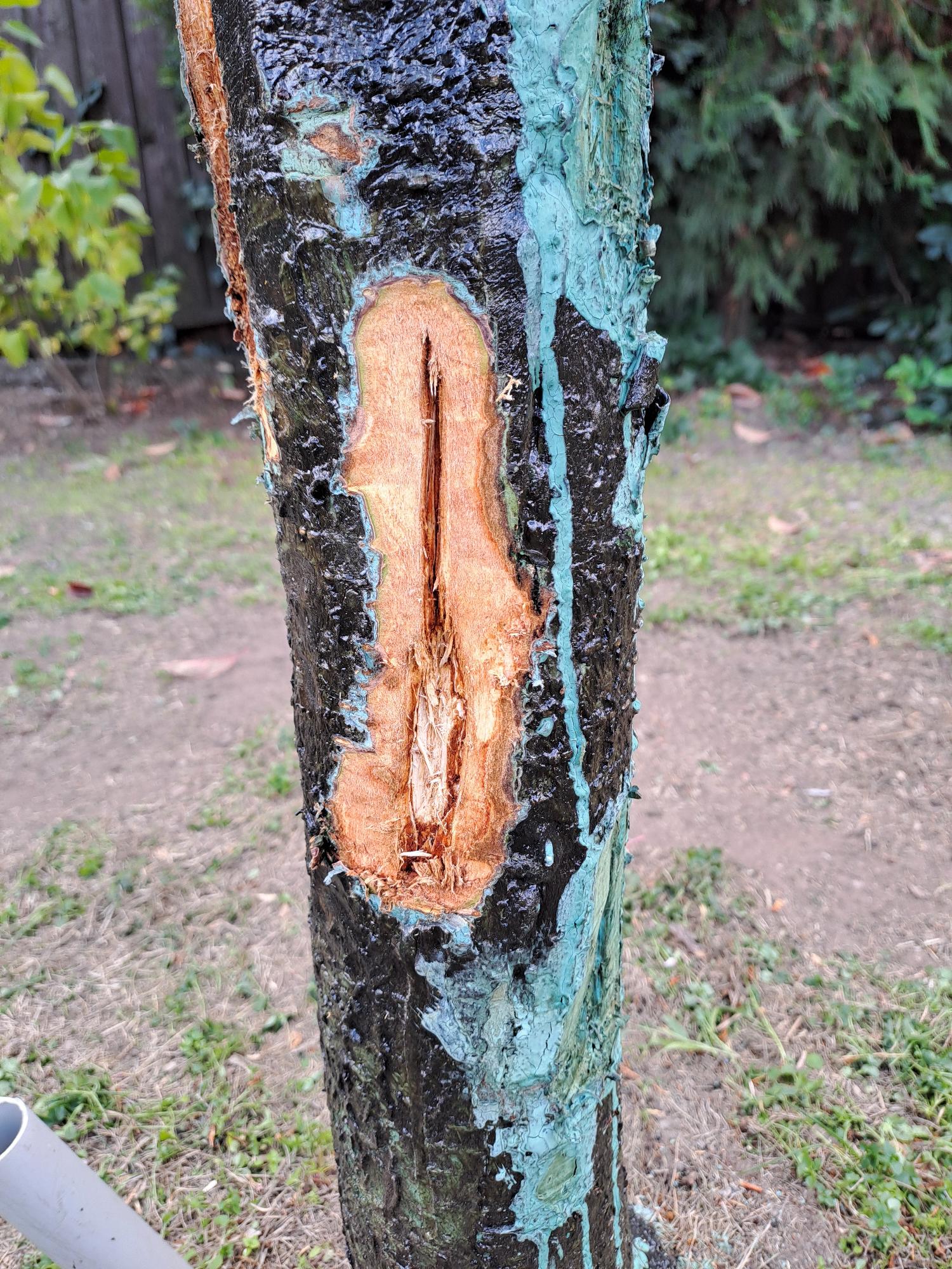 Itt az újabb "kezelésem" eredménye. Ismét kivágtam a mézga alatti részt, amíg tünetmentesnek nem láttam. Igazán mélyre kellett hatolni. Belül olyan barna csík volt látható, ami hasonlított néha a fehérrépa hosszában láthatóhoz. Igyekeztem mindet kivágni a fa másik oldalán is. Sajnos elég sok volt.